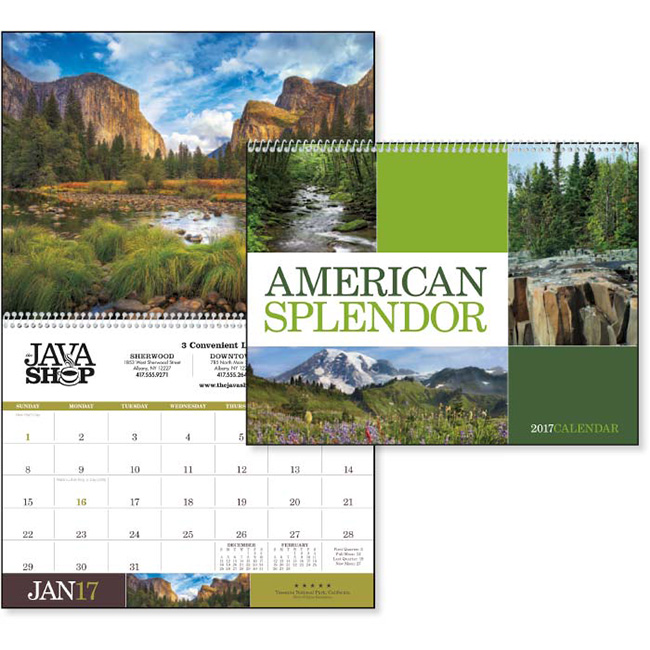 Dazzling scenery brings the outdoor world directly to a home or office. With colorful photographs, this calendar captures the senses. This theme is perfect for any business. Our custom executive calendars are retail quality for your customers. Call 888-332-ADCO for more calendar promotions