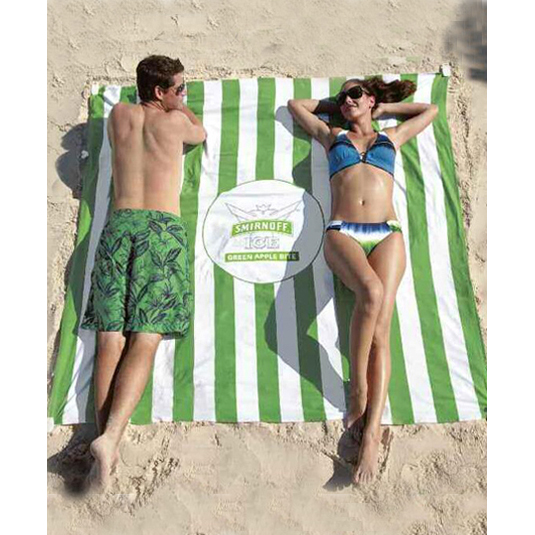 One of our most innovative and popular products, the Beach Blanket Tote transforms from a giant-sized beach blanket to a packable,lightweight, easy-to-carry towel in a totebag. Folds into a convenient tote with handy rope drawstring. Opens up in seconds. Sand Stakes™ are included to keep blanket from blowing away in the wind. Sand StakesTM only available blank. Made from ultra-soft 100% brushed cotton flannel. Price includes blank Sand Stakes™ and your imprint in two locations: on blanket and tote. 6’ x 6’ blanket folds into self-attached totebag roomy enough to carry your beach essentials. Fun color selection!