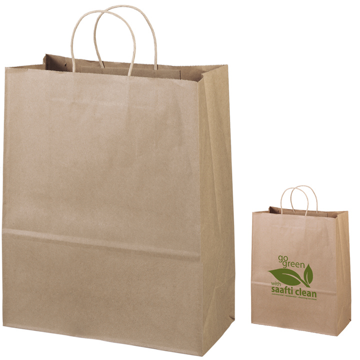 The Citation Brown kraft shoppers made from 100% recycled paper (with a minimum of 95% recycled post-consumer content) with matching twisted paper handles and serrated cut top. All with your custom logo - great for the plastic bag bans and more! An eco promotional item. 13"W X 6" X 15 3/4"H.