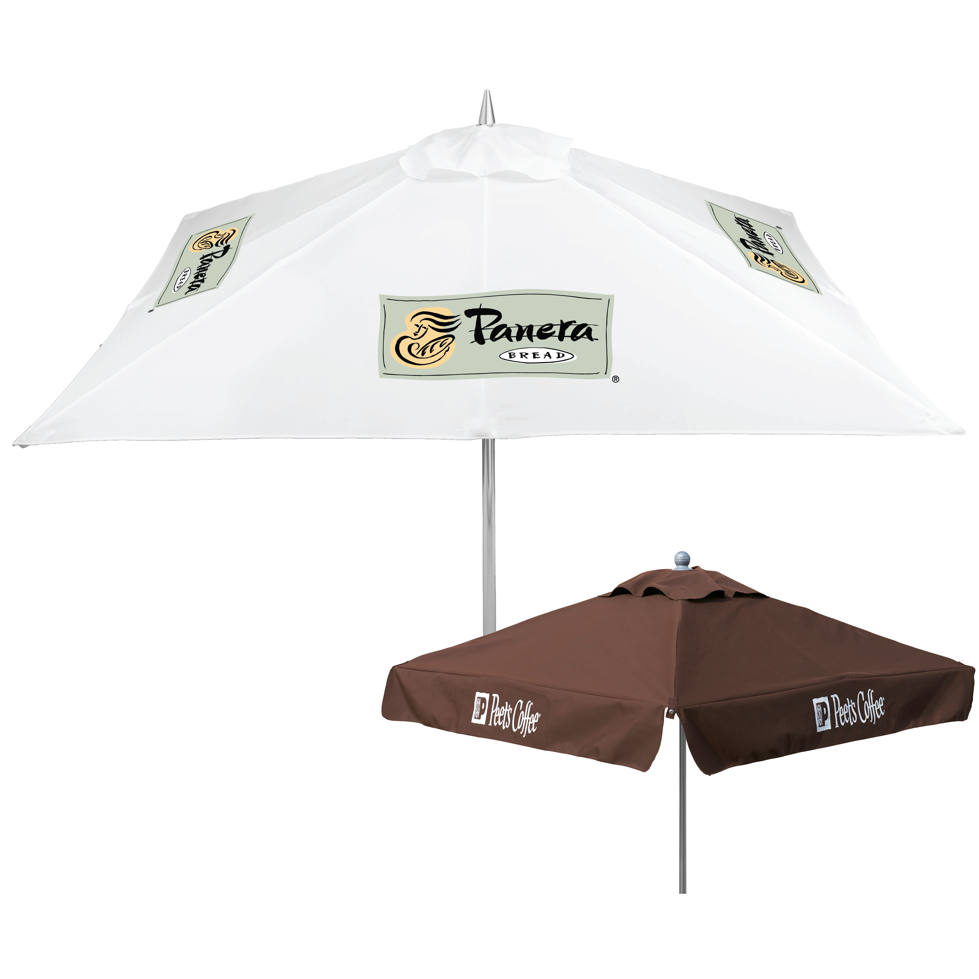 Commercial Grade Custom Umbrella - The Sunset 8 foot Square Market Umbrella with your logo. Its hip to be square. Especially if you're enjoying a cold beverage under our new 8' Sunset commercial grade umbrella. Key features include the stainless steel look of our aluminum frame construction with replaceable ribs and stretchers. Beautifully detailed oversize runner and notch. Available in over 50 Sunbrella colors with a 5 year manufacturer warranty. Made in the USA. This is not your light weight commercial umbrella.