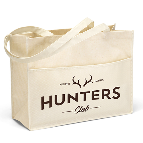 Be on trend and eco friendly with our Dunes Matte Laminated Tote Bags. Our natural color laminated material provides a subtle canvas-like appearance. Made of 105 combined GSM matte laminate, our tote features a large non-woven polypropylene pocket on the front to display your school or company logo and to store your convention handouts. Our long 28” handles are handy to carry tradeshow, conference and festival giveaways!
