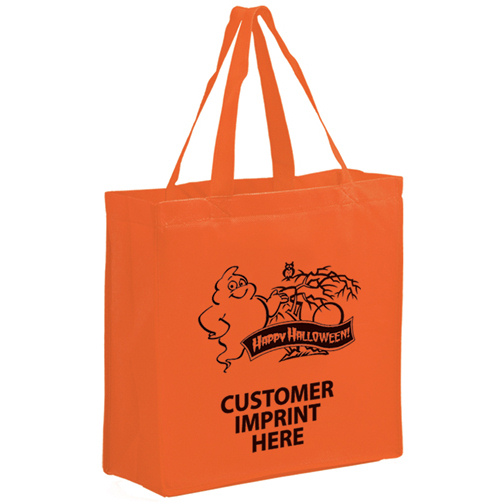 Halloween tote bags - festive and colorful! Bright orange with a stock imprint and your logo and NO SETUP! A great Halloween promotional item. Large size of 13” W x 5” Gusset x 13” H. Comes in Halloween orange.