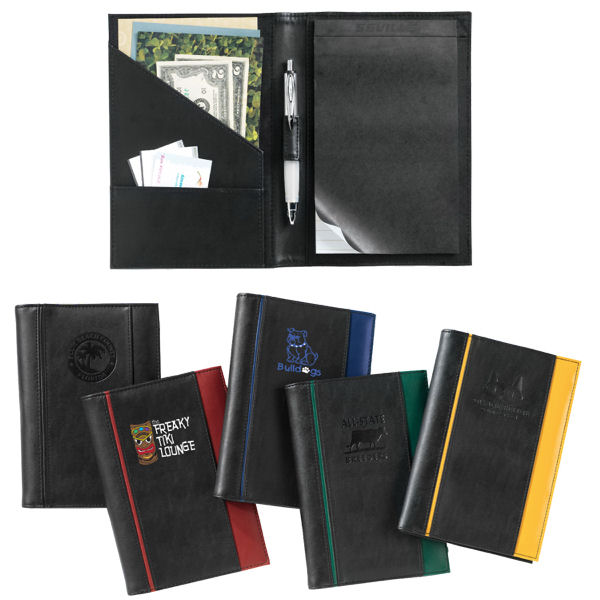 This uniquely styled piece is made with UltraHide Simulated Leather that has the look and soft feel of rich nappa leather and a vertical color accent. It has one large slanted interior pocket for large papers, an additional interior pocket for business cards or other small items, and a wide body pen loop. Includes 5" x 7" writing pad with matching cover to keep your notes private. We love that it comes in so many colors - who really wants another solid black notepad?