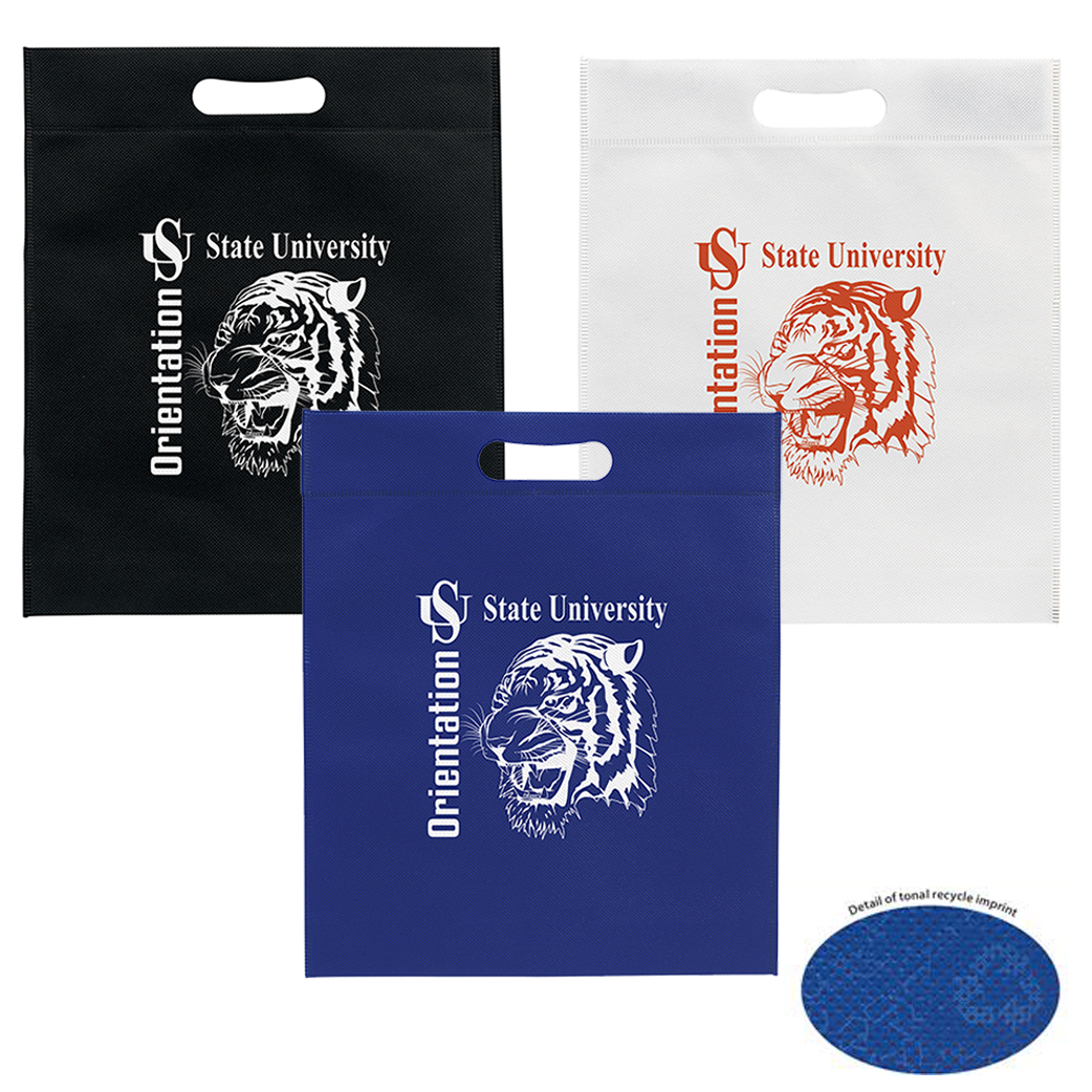 A great substitute for plastic bags. Reusable, contains 20% post industrial recycled content and recyclable! 80 GSM non-woven polypropylene large die cut handle bag with tonal recycle logo imprinted on both sides. Many cities are passing laws forbidding plastic bags and these are a great eco friendly alternative! Full color logo available (inquire for pricing)