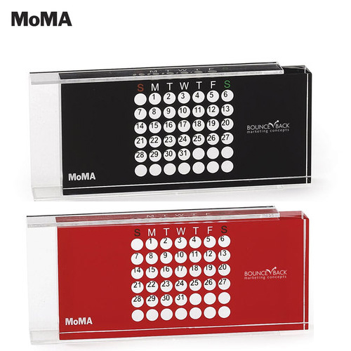 MoMA acrylic perpetual calendar with your custom logo. Slide the back panel to change weekday. MoMA logo screened on front panel. Proceeds from the sale of this MoMA product support the Museum programs. MoMA is known for unique and modern designs and this item is one of their best sellers!