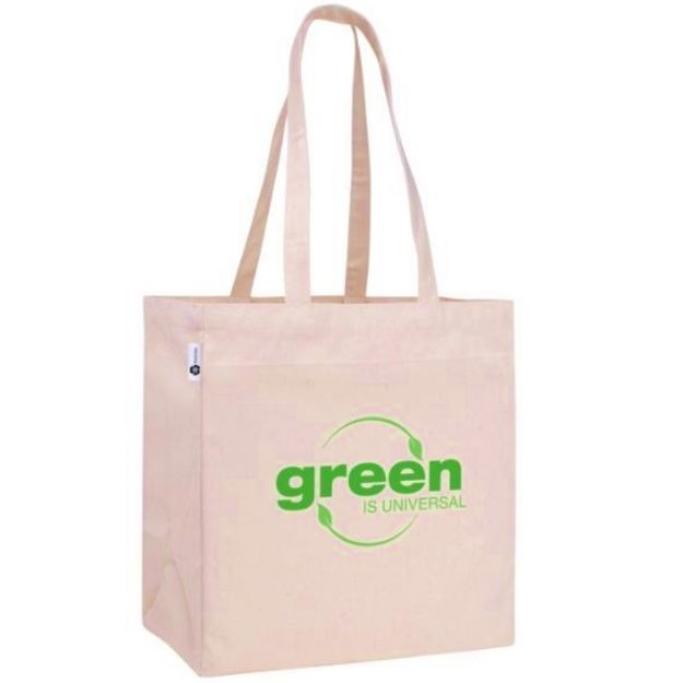 Custom print your logo or design on the NaturalTM Recycled Cotton Tote by Adco Marketing for a great eco-friendly promotional item. Measuring 12.5'W x 14"H x 8.5"D, with 26" handles, it is made from 85% recycled cotton, it also features a recycled cardboard post-industrial insert for added structure and durability. This bag also is recyclable too! The ideal giveaway for events or tradeshows which promote environmental awareness as well as for resale in markets that sell natural and organic foods.