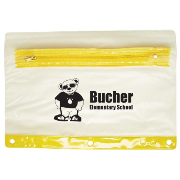 Vinyl zip-up pouch. Three hole punch ready. Perfect for school organization, The kids will be using this promotional item all year long! Please inquire for pricing to add imprinted pencils, sharpeners, rulers and more.
