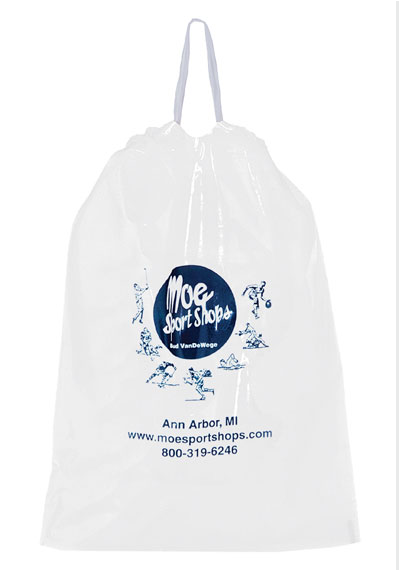Poly Draw-Tape Handle Custom Plastic Bags 12 x 15 x 3 Gusset with your logo.2.5 mil. low density. Comes in white. Great bag promotional item perfect for tradeshow or retail outlets.
