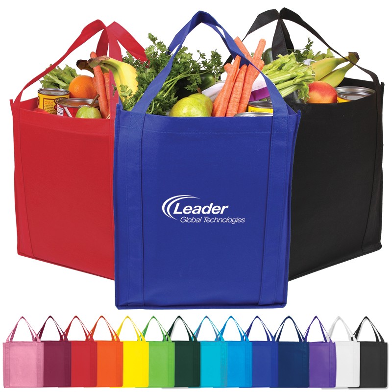 Alternative to Plastic Grocery Bag Waste! Jumbo Totes feature a spacious open main compartment with a 10" Gusset, removable rigid bottom insert and 20" long reinforced handles. Great for grocery shopping, bookstores, real estate, assisted living, banks, volunteer giveaways, food banks and more! We love our cusotm tote bags, give us a call for free samples at 888-332-ADCO!