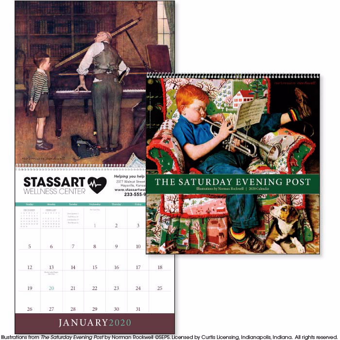 Promote your business with this custom Saturday Evening Post Calendar. Featuring warm hearted, nostalgic illustrations by beloved artist Norman Rockwell your clients will associate your business with the comfort of simpler times in an increasingly busy world. Each month features a full color illustration from The Saturday Evening Post. With your custom logo this retail quality calendar will build your business every day of the year. This promotional calendar is full color and printed in the USA.